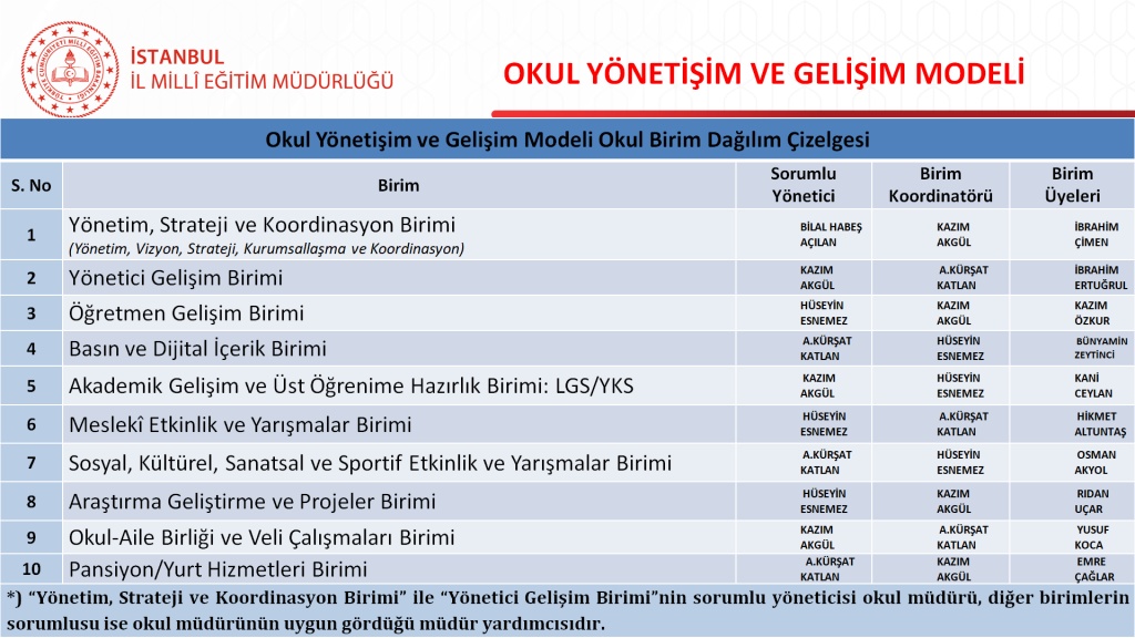 Okul Yönetişim ve Gelişim Modeli Okul Birim Dağılım Çizelgesi